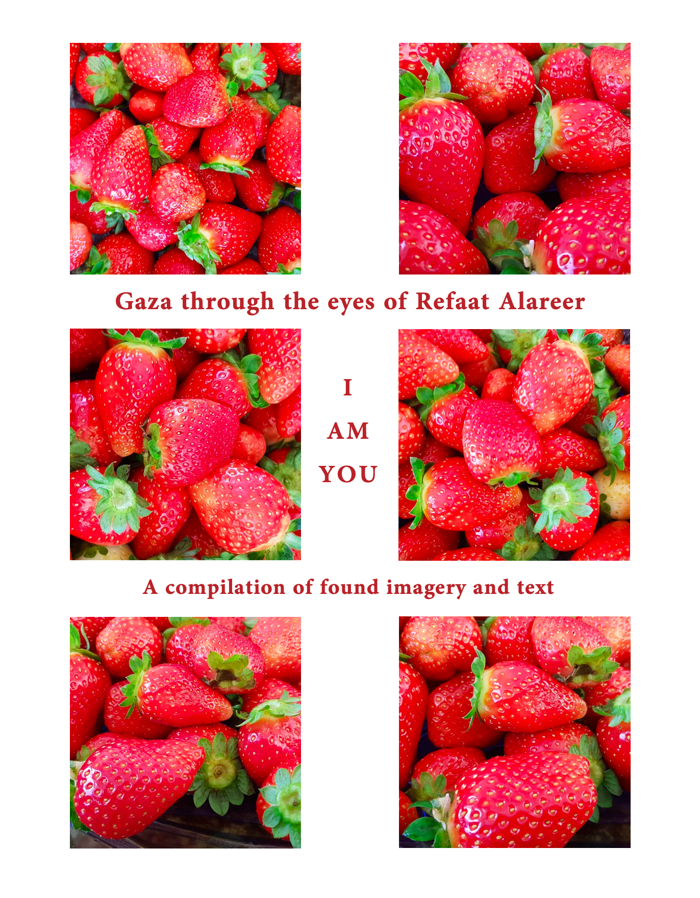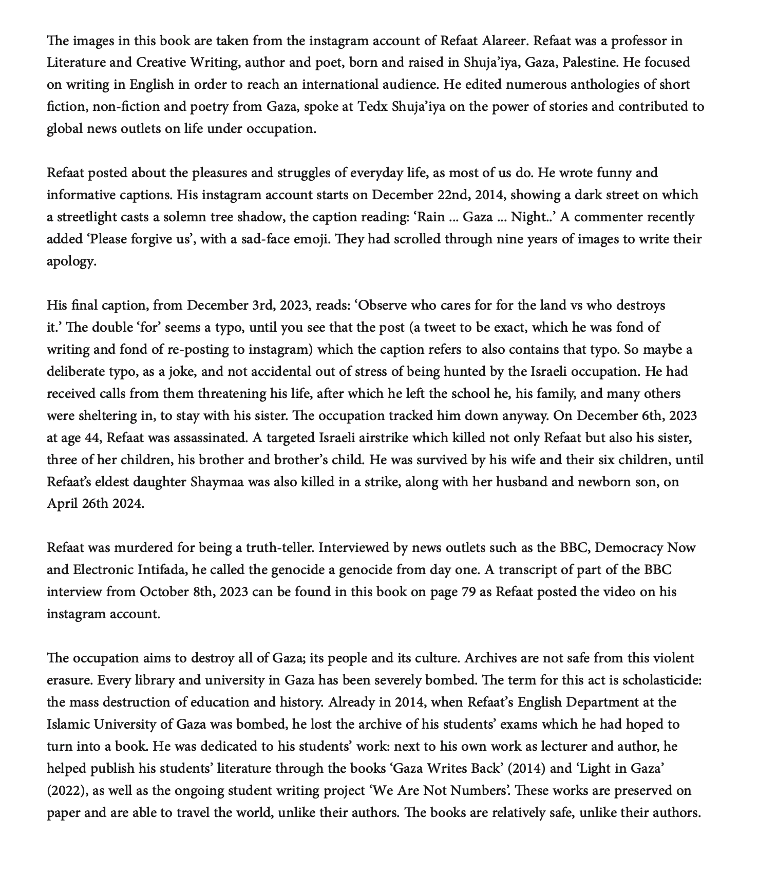 Refaat Alareer was a poet, professor of literature, and public intellectual from Gaza, Palestine, who was assassinated in December 2023 by the Israeli occupation. This book is a collection of social media images Refaat shared in the decade prior to his death, as well as his poetry.