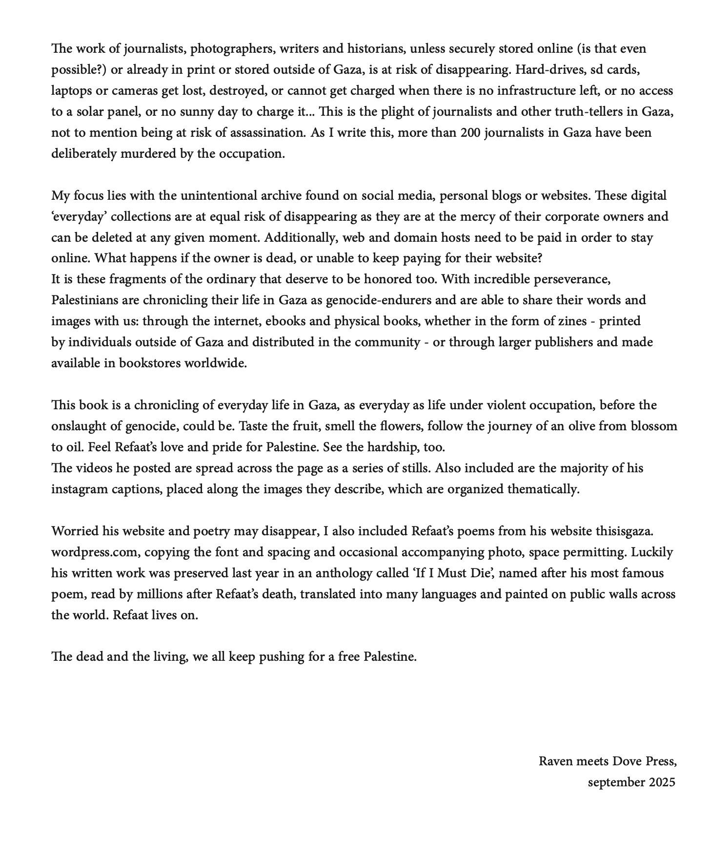 Organized thematically, it preserves glimpses of his everyday life—family, academia, food, nature, memes, writings by himself and others—alongside the other side of daily life in Gaza: surviving under violent occupation. Bringing these images from the digital sphere to paper, lest his online account disappear, is an effort to honor the memory of Refaat Alareer, who stood up for Gaza and told us: “If I must die, you must live to tell my story.”
